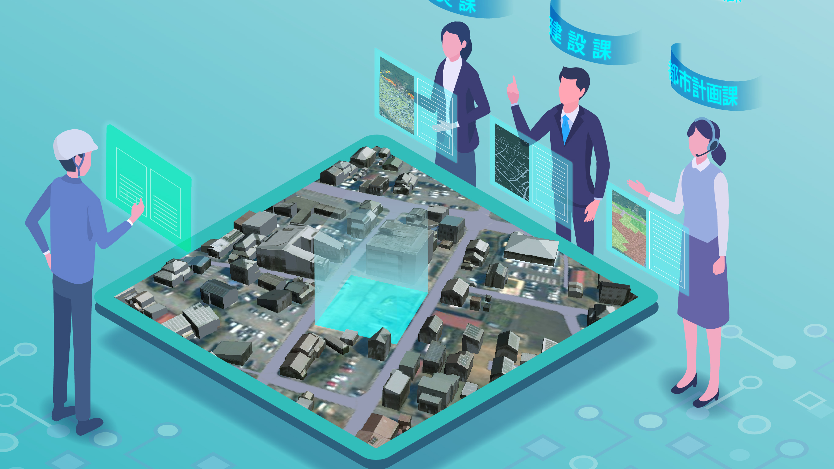 空間情報を三次元表示可能なCesiumJS及びTerriaJSをフロントエンドで利用するとともに、PostGIS(空間情報を管理するOSSのデータベース拡張機能)と GeoServer(空間情報を共有するOSSのGISサーバ)を組み合わせ、空間解析機能及びリレーショナルデータベースをバックエンドで統合したウェブシステムを開発しました。 開発したシステムには、①地番図を用いた検索機能、②概況診断結果のレポート出力機能、③行政担当者への申請機能、④行政担当者の申請情報検索及び回答確認機能、⑤行政担当者への問合せ機能を実装しています。